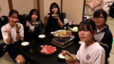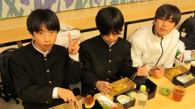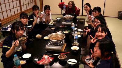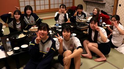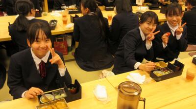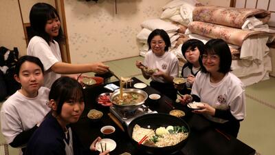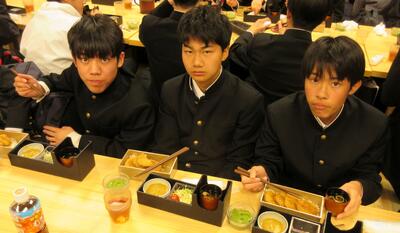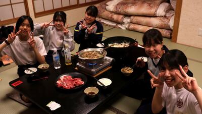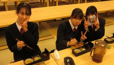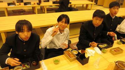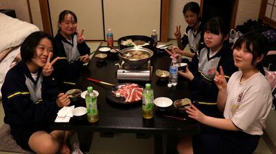 16時40分にはすべての班が帰着報告を終え、部屋に戻りました。お土産を手にしている生徒がたくさんいました。その後、夕食をいただきました。メニューはすき焼きでした。牛肉を頬張るときには笑みがこぼれていました。