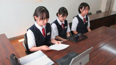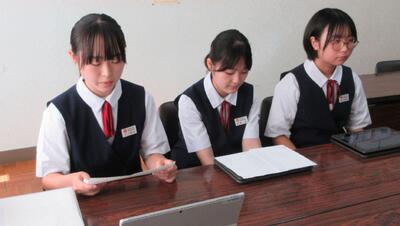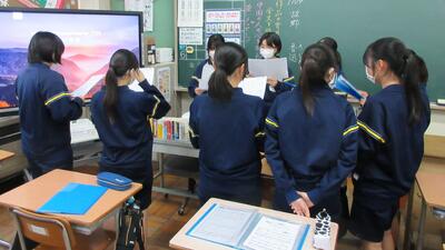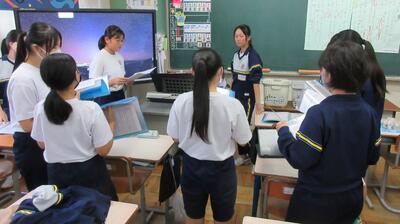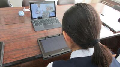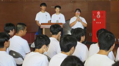 校内での報告会を朝の時間にリモートで行いました。本校からは3名の生徒が参加しました。