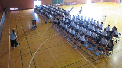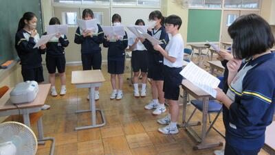 合唱コンクールで歌う学年曲「COSMOS」を体育館で歌いました。よく声が出ていて、はじめてにしては素晴らしい合唱でした。