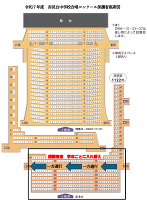 10月10日(金)合唱コンクール保護者座席図 投稿: 赤見台中学校 (14:00) 今月の30日(木)にクレアこうのすで行われる合唱コンクールのときの保護者の方の座席図を掲載いたしました。ホームのPDFファイルを開いてご確認ください。 Tweet -
