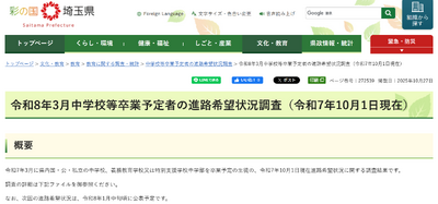本日、埼玉県教育委員会のホームページに10月1日現在の令和8年3月中学校等卒業予定者の進路希望状況調査の結果が掲載されましたので、お知らせいたします。下記URLをクリックするか、メニューの進路指導をクリックしてご覧ください。