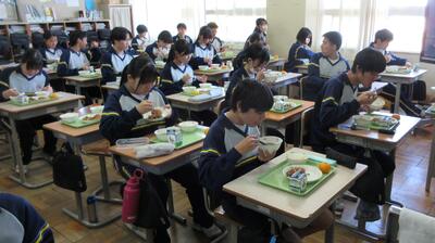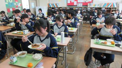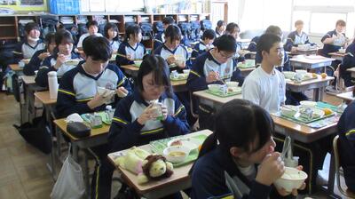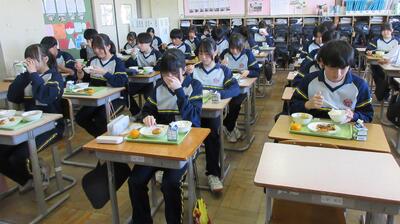 先週から学級閉鎖になっているクラスや学年があるため、前向きで給食を食べています。
