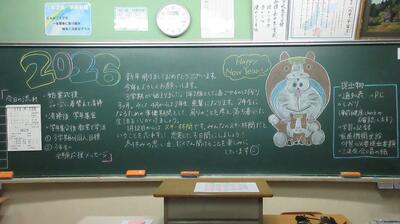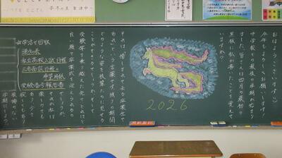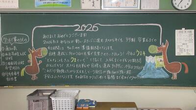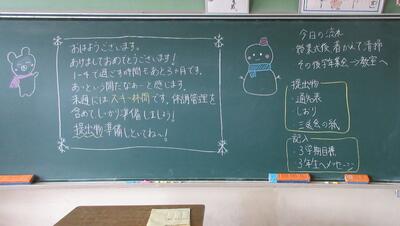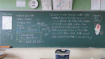 今朝はかなり冷え込みましたが、新年に相応しい素晴らしい天気になりました。各教室の黒板には担任の先生が書かれたメッセージがたくさん見られました。